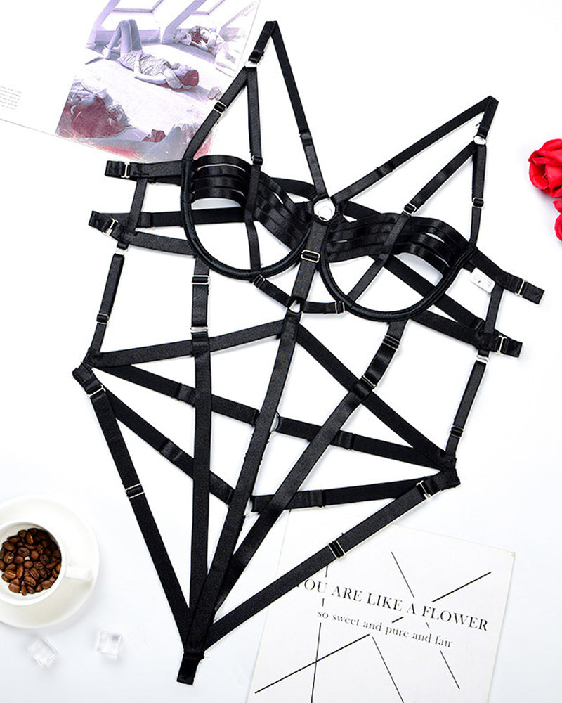 Unleash your daring side with this striking bondage-inspired bodysuit. Its intricate cross-strap design creates a complex web of visual intrigue, sculpting and accentuating your curves for an unforgettably powerful look.