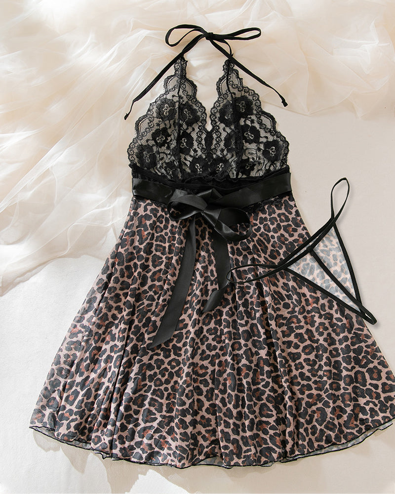 Deep V-neck Sexy Lace Trim Leopard Print Mesh Nightgown and Thong Set