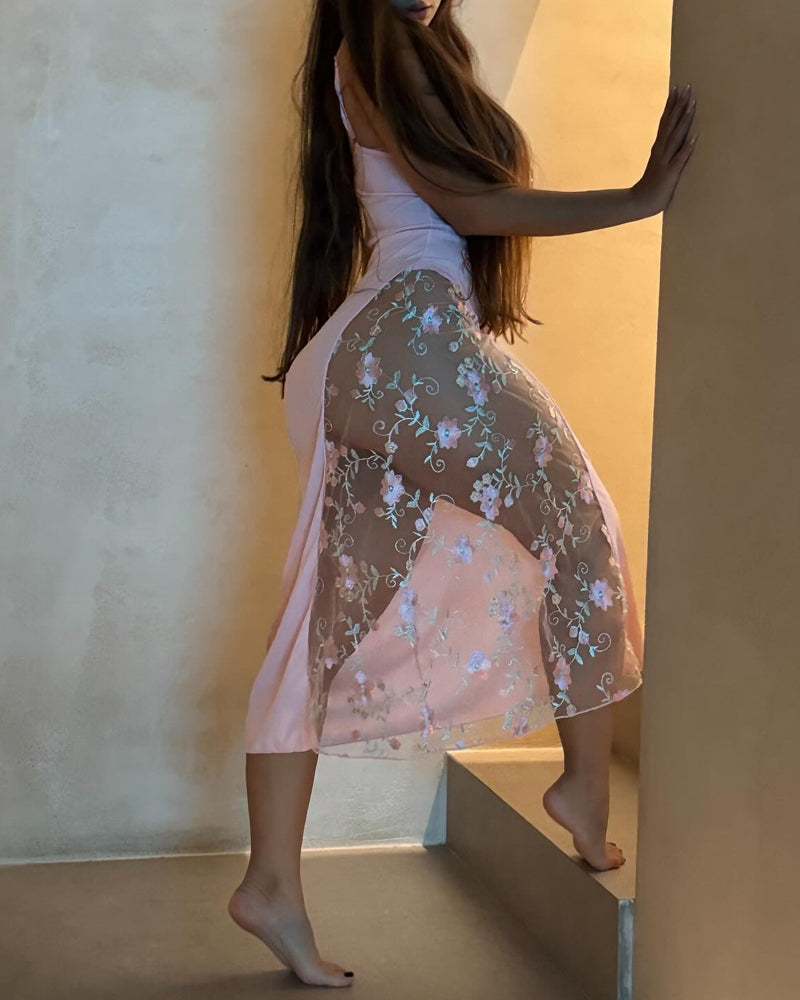 Deep V Sexy Mesh See-through Embroidered Floral Long Slip Dress