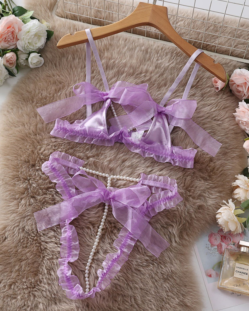 Lace Mesh Bow Tie Pearl Decoration Lingerie Set