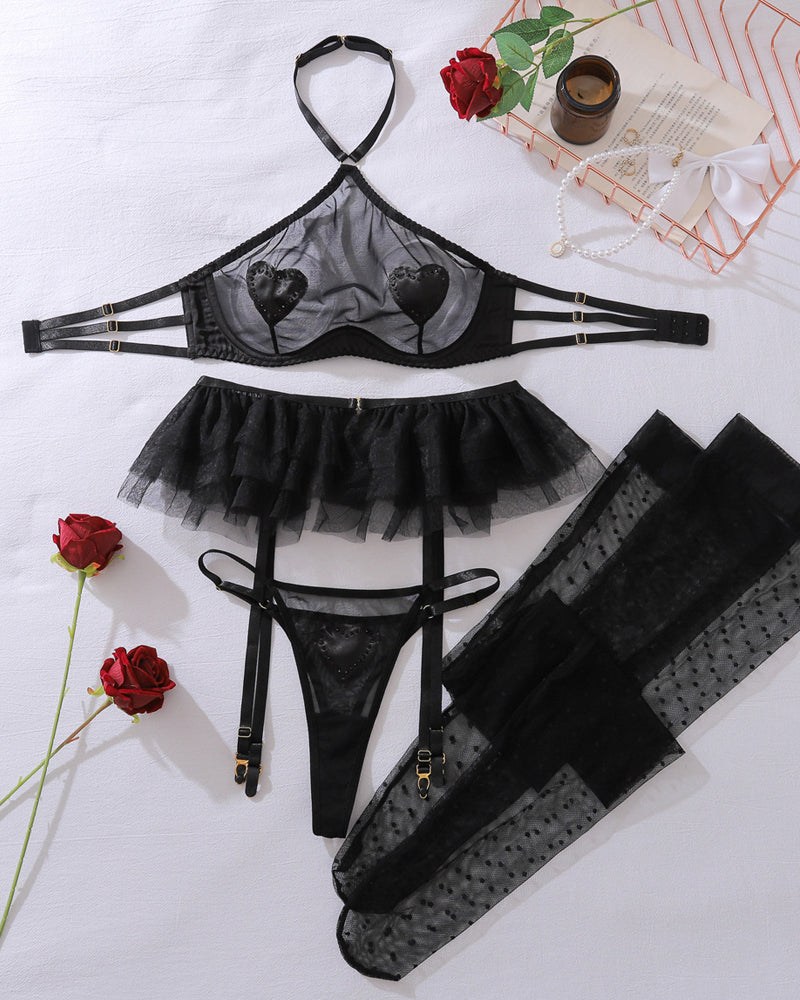 Wear your heart with daring elegance in this complete lingerie ensemble. Featuring a sheer mesh halter neck design with romantic heart motifs and matching stockings, this set offers head-to-toe allure with a touch of playful seduction.