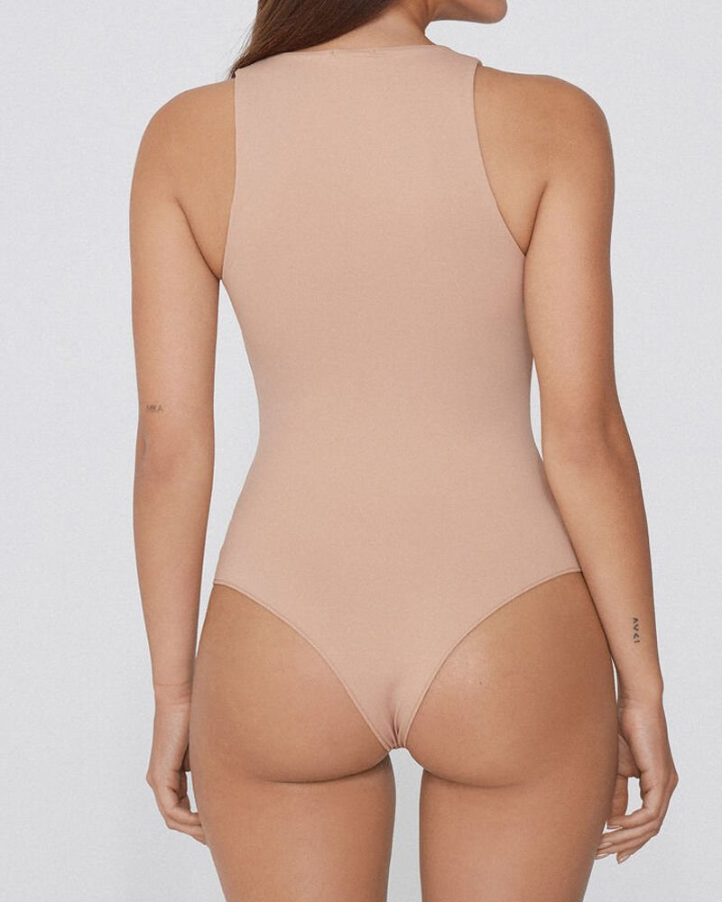 Experience effortless style and support in this versatile bodysuit. The seamless round neck design and built-in bra cups provide a smooth, flattering silhouette, while the stretchy fabric hugs your curves comfortably. Perfect for layering or wearing alone, this piece offers all-day confidence and ease.
