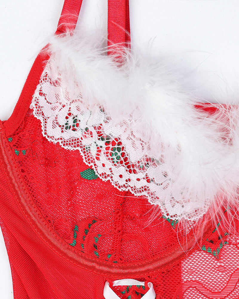 Unwrap festive allure in this seductive Christmas lingerie set. Delicate lace and sheer mesh create a tantalizing see-through effect, while matching stockings complete the head-to-toe holiday look. Perfect for intimate celebrations or gifting, this set blends seasonal charm with provocative elegance.