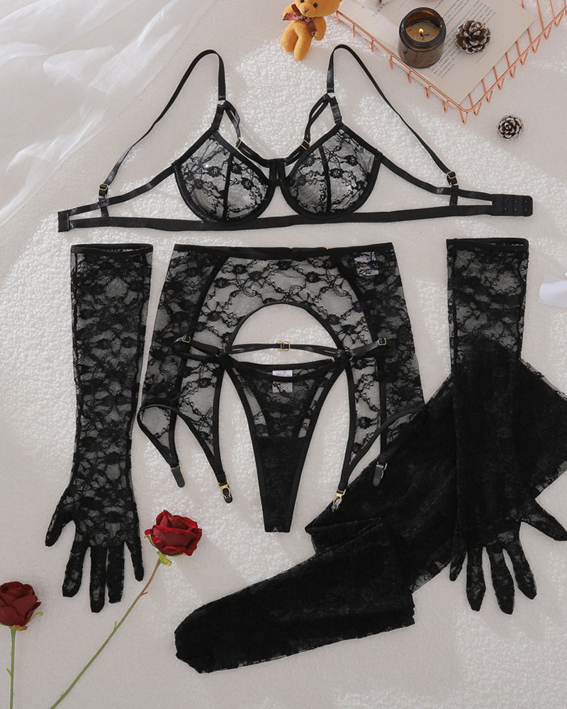Complete Ensemble: Includes lingerie set with suspender and sheer see-through stockings