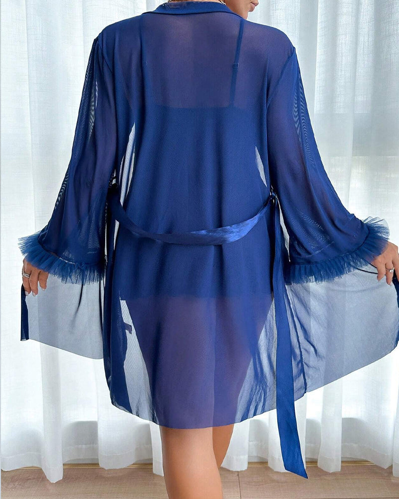 Sheer Mesh Kimono Robe: Flowy flutter sleeves and waist tie offer adjustable coverage and graceful movement.
