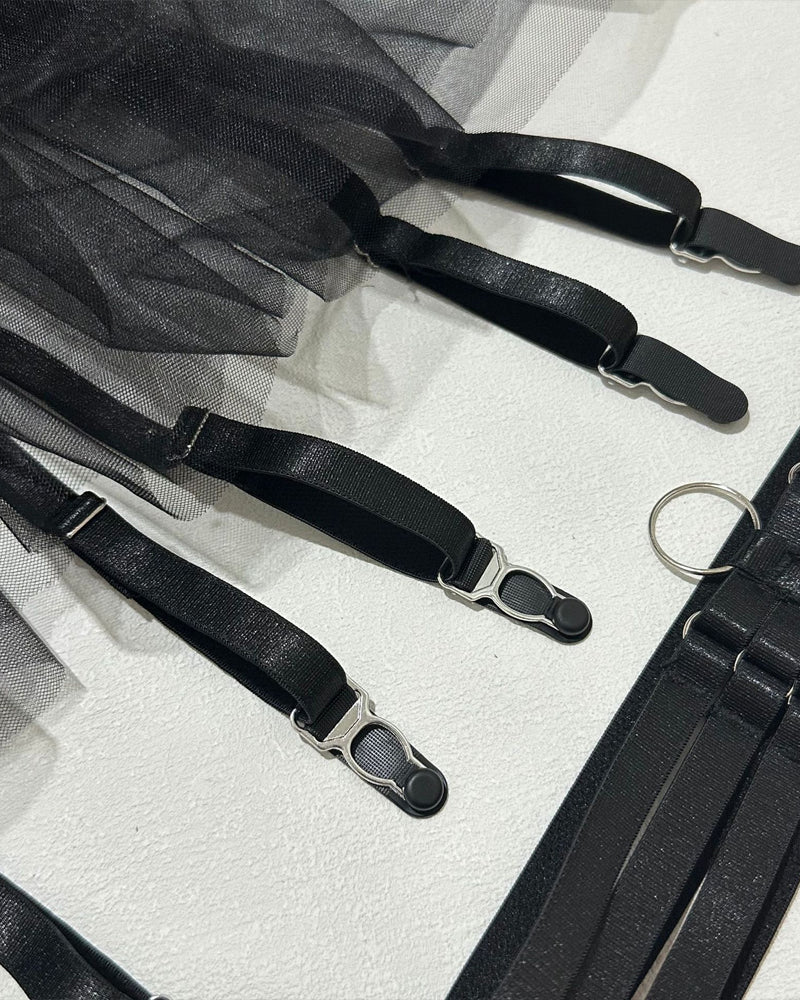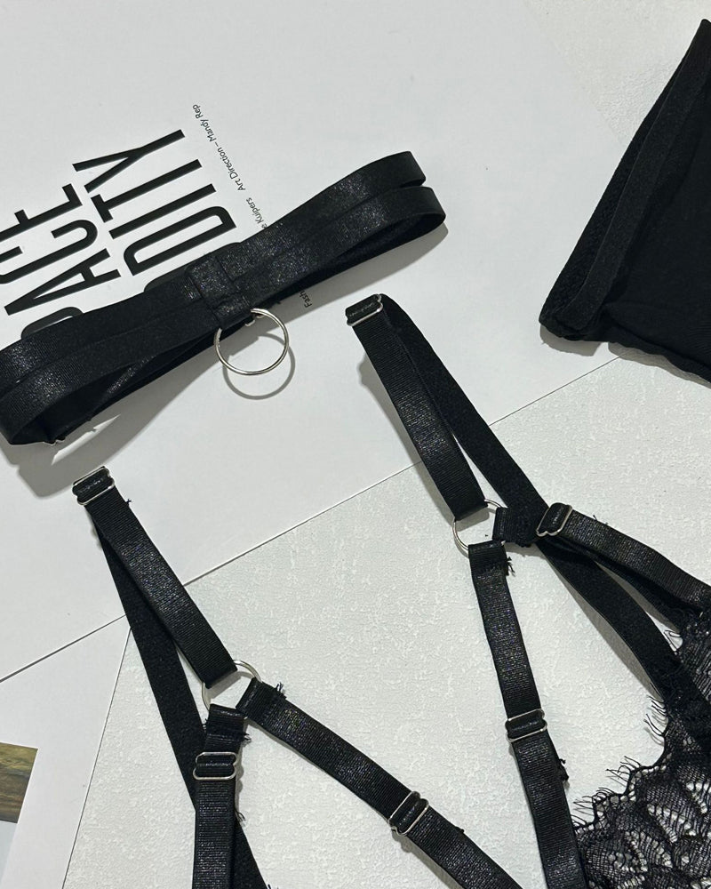 Step into the spotlight with this daring and feminine six-piece set that blends sophistication with sultry charm. Whether you're surprising a loved one or treating yourself, this ensemble is sure to leave a lasting impression.