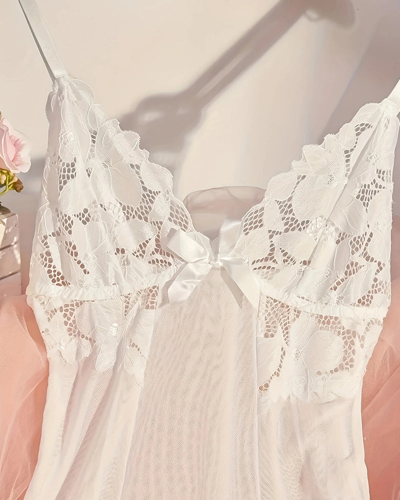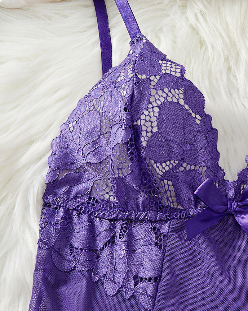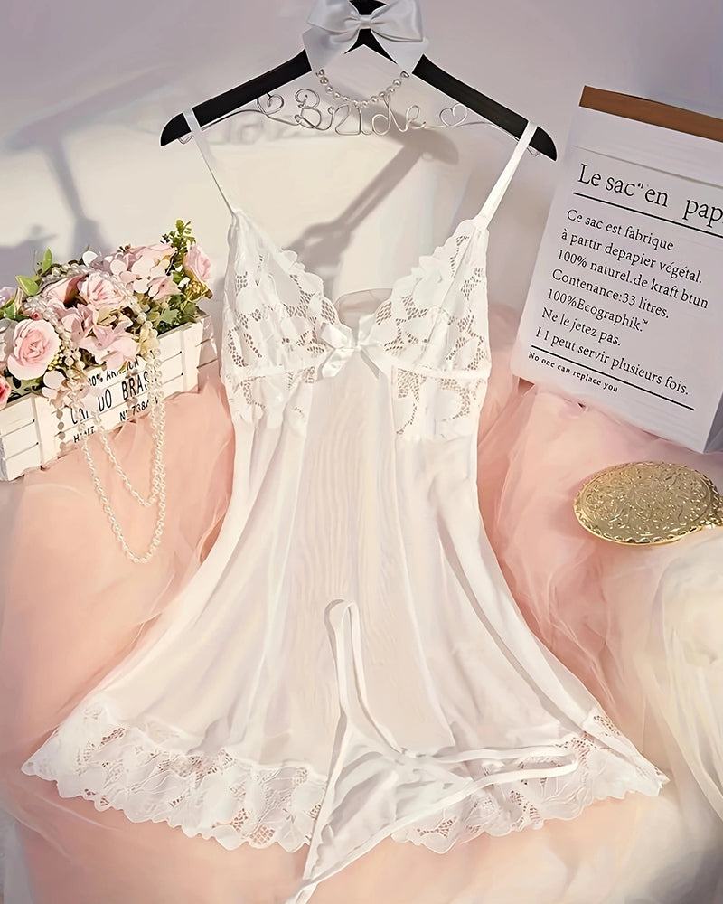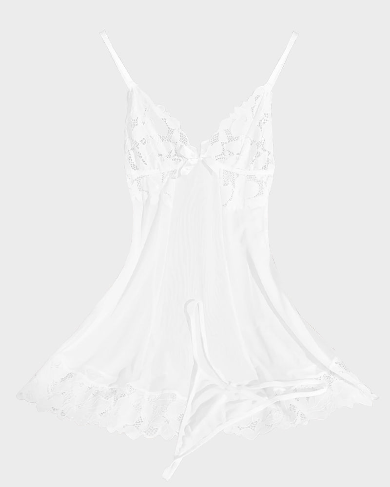 Elevate your evening wear with the V-Neck Sheer Lace Mesh Nightgown with G-String, a captivating ensemble designed to make you feel both elegant and alluring. This stunning nightgown features a delicate sheer lace overlay and a flattering V-neckline that beautifully highlights your figure, making it the perfect choice for romantic nights or special occasions.
