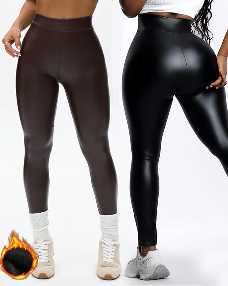 Stay warm and stylish with these high-waisted leggings. Featuring a cozy fleece lining and sleek faux leather PU exterior, they sculpt your waist, smooth your tummy, and add a retro edge to any outfit. Perfect for winter workouts, casual days, or layered streetwear.
